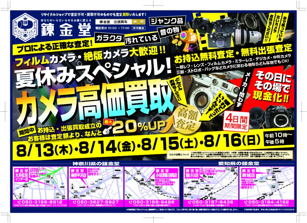 【終了】【錬金堂全店】☆夏休みスペシャル☆カメラ高価買取フェア