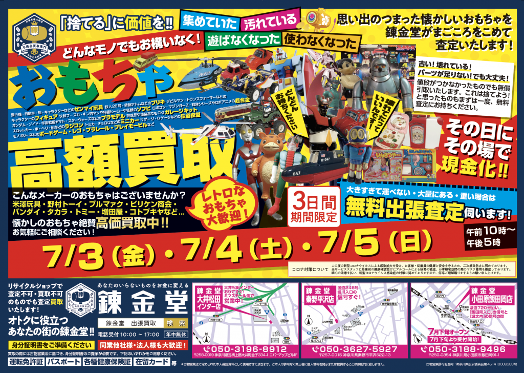 | 内容 | 古くて使いみちがない・押し入れの奥に眠ったまま思い出のつまった懐かしいおもちゃ、まごころをこめて錬金堂が査定いたします! 飛行機・自動車・船・キャラクターなどのゼンマイ玩具、ウルトラマンや仮面ライダー・鉄人28号・鉄腕アトムなどのブリキ、デビルマン・トランスフォーマーその他キャラクターのフィギュア、快獣ブースカ・キン肉マンや特撮ヒーローや怪獣のソフビ、ガンダム・ゾイド・宇宙戦艦ヤマト・スターウォーズなどのプラモデル、完成品や塗装品でもOK!ガレージキット、ロボコン・マジンガーZ・戦隊シリーズやロボアニメの超合金、スロットカー・車・ヘリ・船などのラジコン、トミカ・チョロQなどのミニカー、Nゲージ・Oゲージなどの鉄道模型、遊ばなくなったレトロなおもちゃ大歓迎!お気軽にご相談ください! |