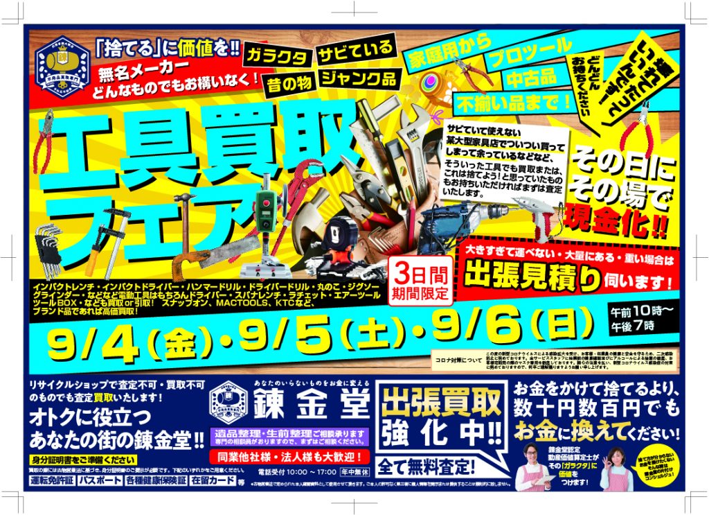 | 内容 | お家にある錆びて使えない工具、余分に買ってしまった工具、不揃いの工具や電動ドライバー、インパクトなどのプロツールまで工具ならなんでも査定いたします! 大型のものなら出張査定にお伺いします! この機会にいらない工具を現金化!整理しちゃいましょう! |